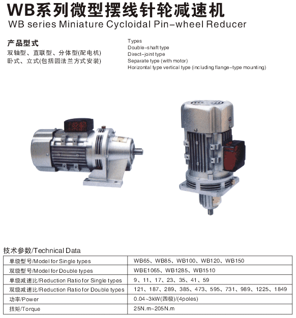 1、單級(jí)系列有WB65型、WB85型、WB100型、WB120型、WB150型。減速比分別有9、11、17、23、29、35、43、59、71、87。
